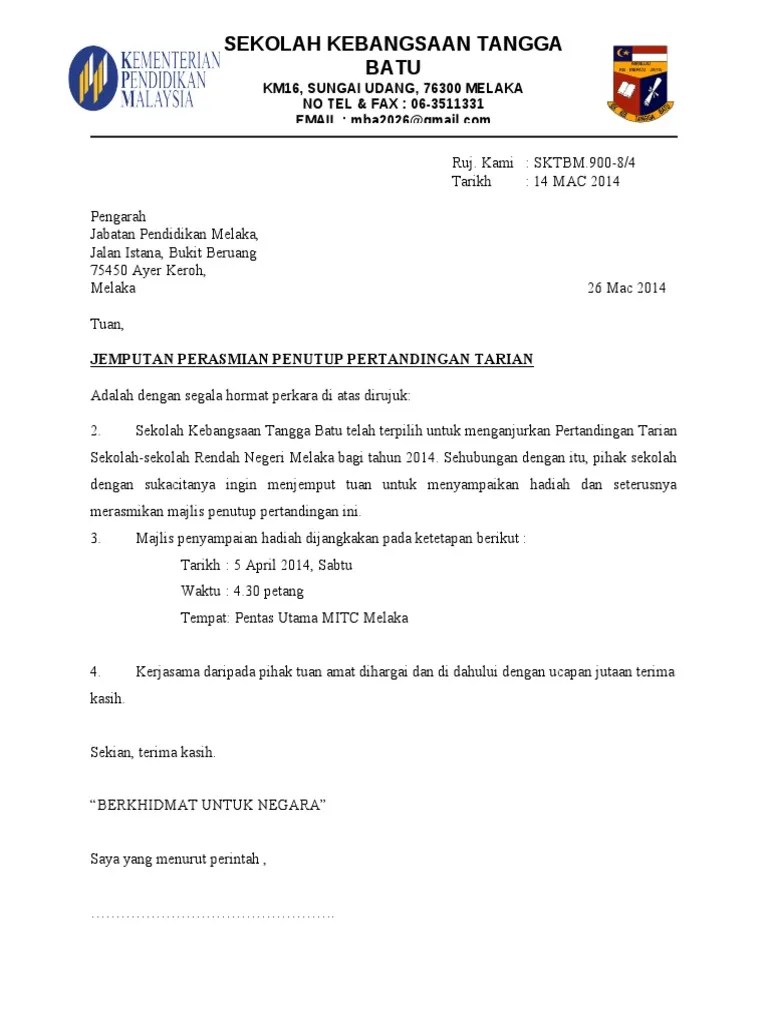 Surat jemputan vip untuk perasmian. Permohonan sumbangan penghawa dingin smkdk 2010. Kem elit p3 negeri trg : Seseorany yang dilantik secara rasmi untuk dipertanggungjawabkan mengendalikan sesebuah majlis mengikut aturcara yang telah ditetapkan dan merujuk kepada skrip yang telah diluluskan serta berpandukana arahan pegawai … Ini adalah contoh surat makluman kepada pihak polis tentang aktiviti yang ingin dijalankan di sesuatu tempat. By nadiaburn143 in types > instruction manuals, polis, and surat. 03.10.2021 · kami akan memberikan contoh teks pengacara majlis persaraan guru atau staff sekolah tersebut. Ini adalah contoh surat makluman kepada pihak polis tentang aktiviti yang ingin dijalankan di sesuatu tempat. Baca versi flipbook dari laporan akhir latihan industri (siti hajar aishah binti zainuddin, bb180041).